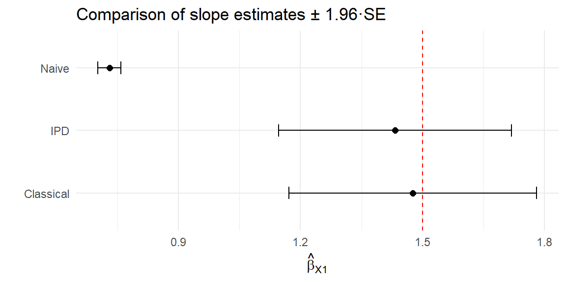 Compare the naive, classical, and IPD estimates of \(\beta\).