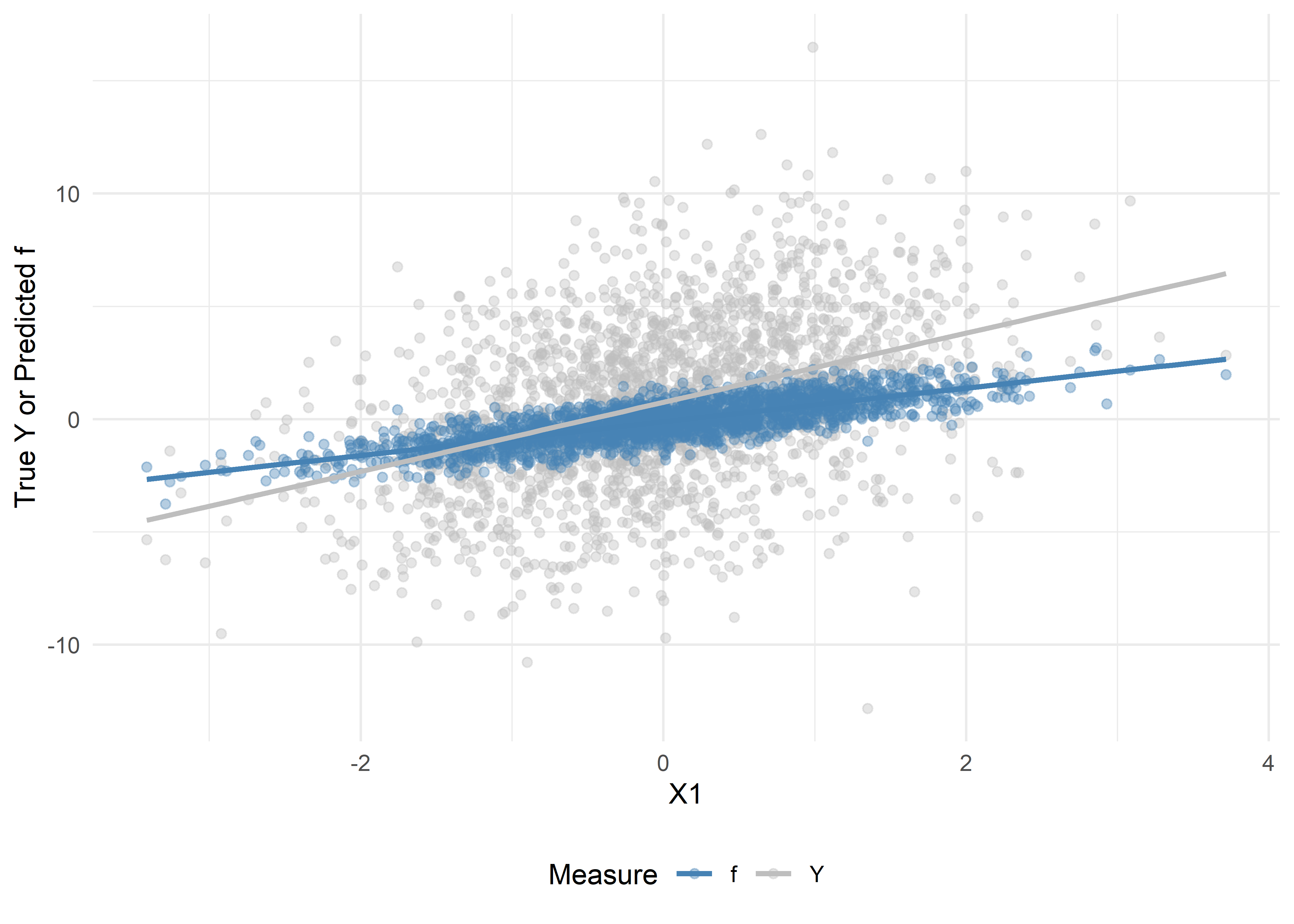 # Prepare datadat_visualize <- dat_ipd |>select(X1, Y, f) |>pivot_longer(Y:f, names_to ="Measure", values_to ="Value") |>arrange(Measure)# Scatter + trend linesggplot(dat_visualize, aes(x = X1, y = Value, color = Measure)) +theme_minimal() +geom_point(alpha =0.4) +geom_smooth(method ="lm", se =FALSE) +scale_color_manual(values =c("steelblue", "gray")) +labs(x ="X1",y ="True Y or Predicted f",color ="Measure" ) +theme(legend.position ="bottom")