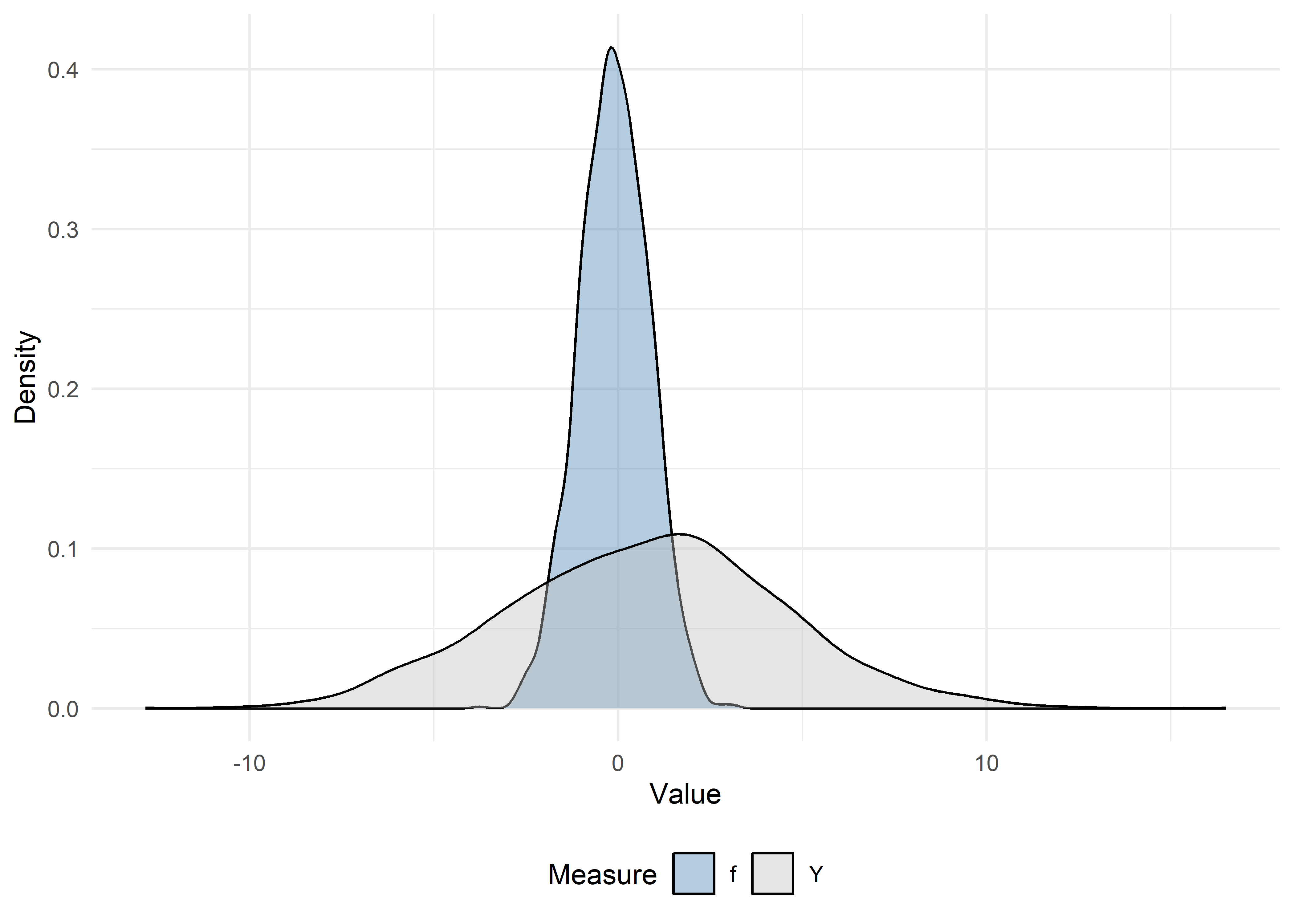 In the density plot, you can see that the spread of \(f\) is narrower than that of \(Y\), illustrating that the predictive model has reduced variance (often due to “regression to the mean”).
